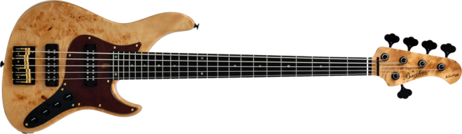 Black & Goldのコンビネーションブリッジを採用するなど、高級感のあるルックスで個性的な一本です。プリアンプにアギュラーOBP-2を搭載、2バンドイコライザーでダイナミックな音作りが可能です。4、5弦合せて20本の限定製作モデルとなります。