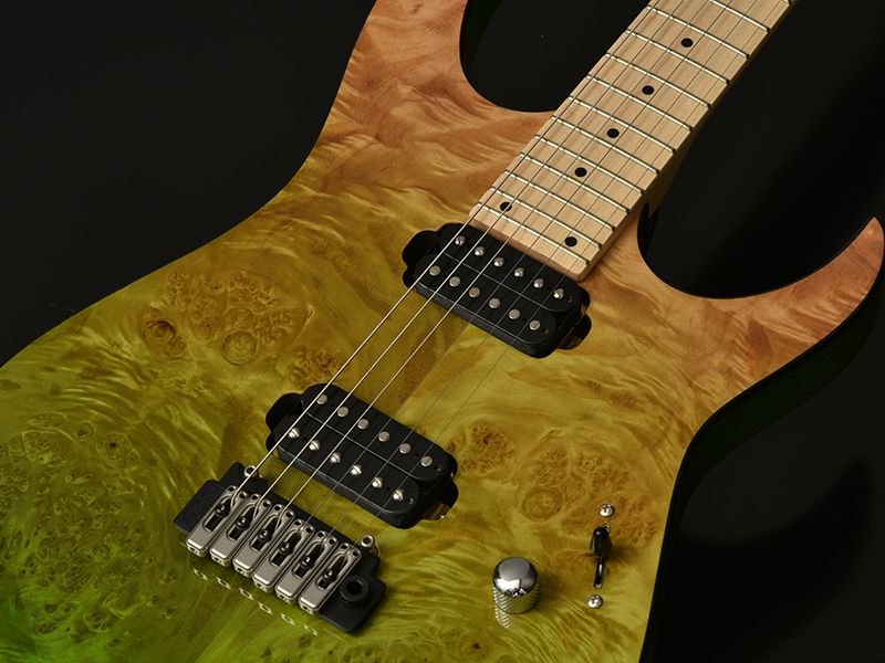 フラットトップのエレキギターで、ハムバッカーピックアップを搭載した太く分厚いサウンドが特徴のモデルです。ボディにはバールメイプルを採用しており、杢目を活かすために鮮やかなグラデーションカラーで仕上げています。
