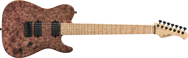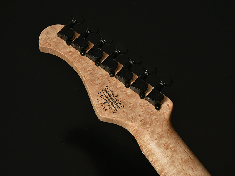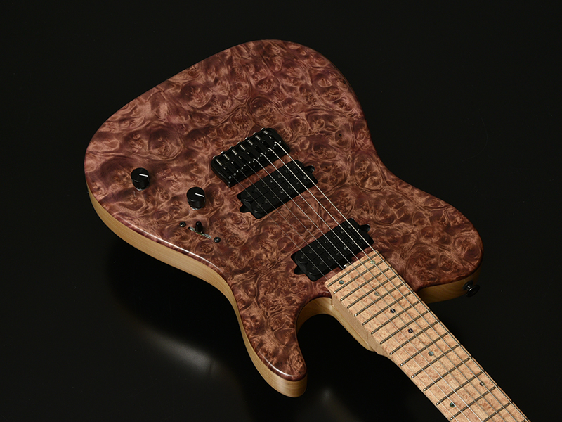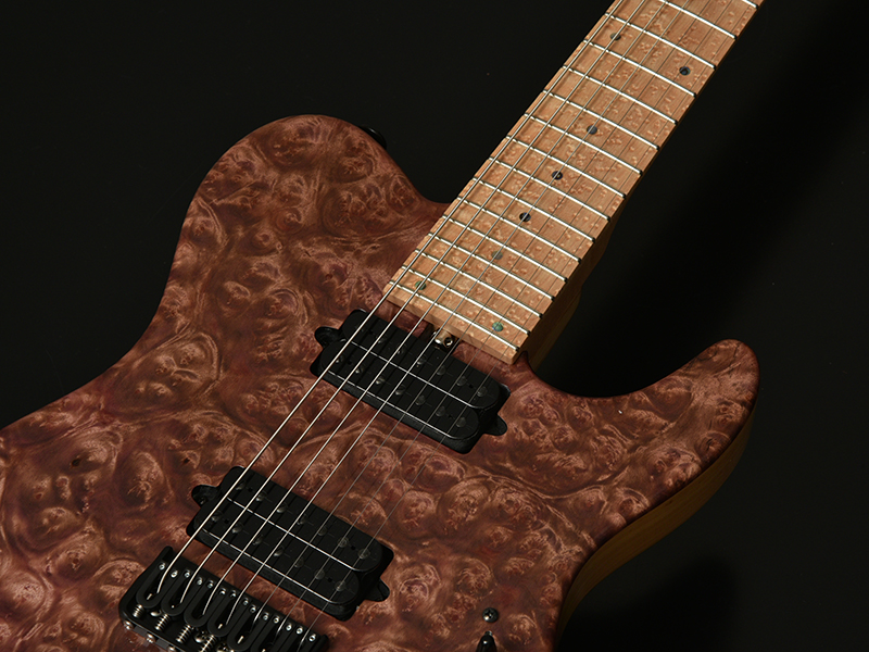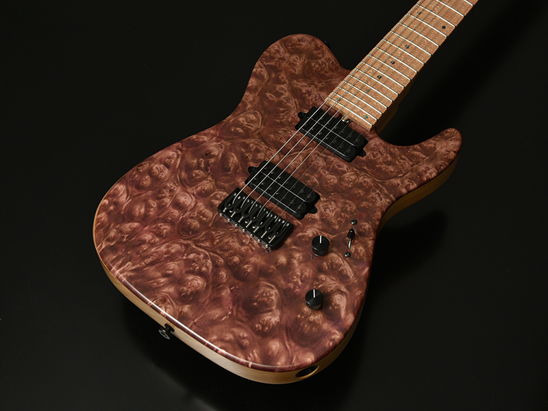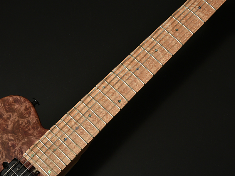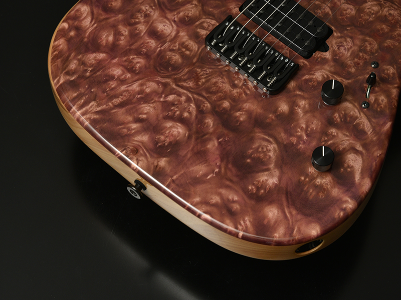 MARBLE WOOD:マーブルウッドとは大理石という意味があり、独特な光沢感とインパクトの大きな瘤模様が特徴で堅さのある希少材となります。別名「黄金樟」とも呼ばれる非常に希少な材で、ミャンマーでは三大国宝にも数えられています。インパクトのある瘤杢と、無着色では金色に輝くような独特の色合いが特徴であり、材の特性・風合いをより際立たせる生地着色にてパープルカラーを施しました。バーズアイメイプルのネック・指板と相まって、希少価値の高い高級感あふれるT7モデルに仕上がっています。