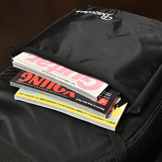 大きくて厚みのある外ポケットには、分厚いA4サイズの雑誌や譜面などもラクラク入ります。