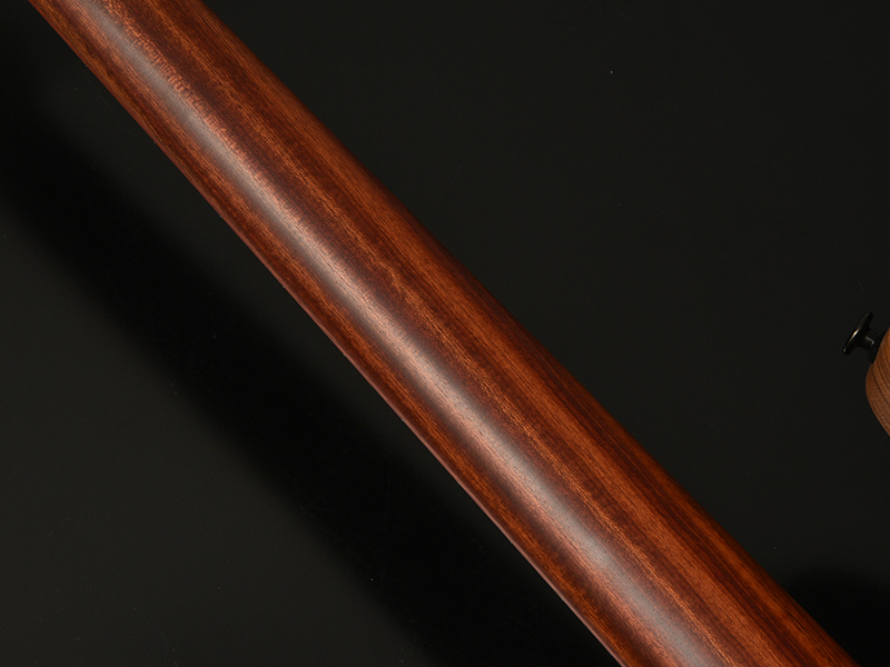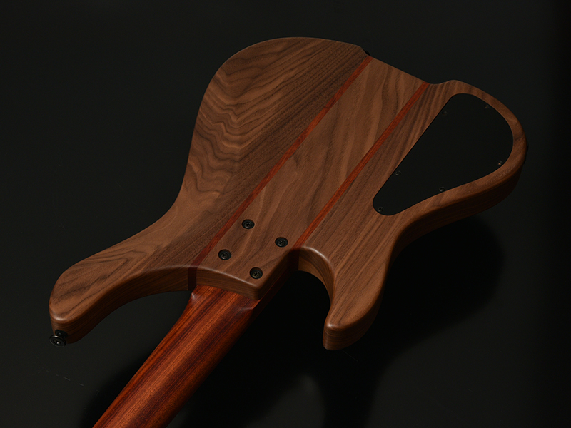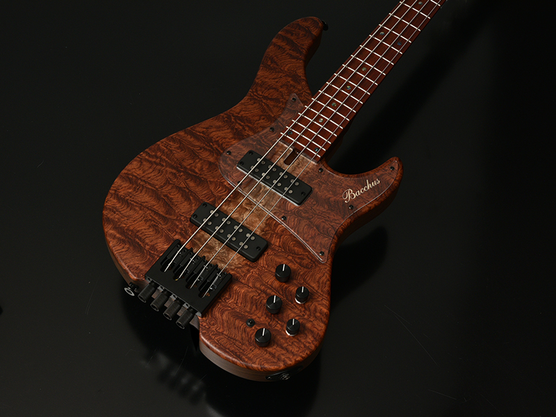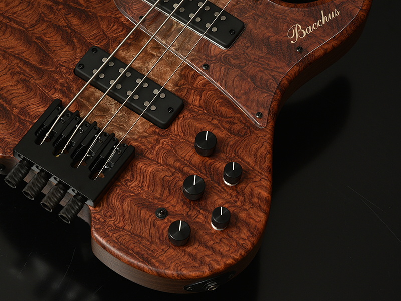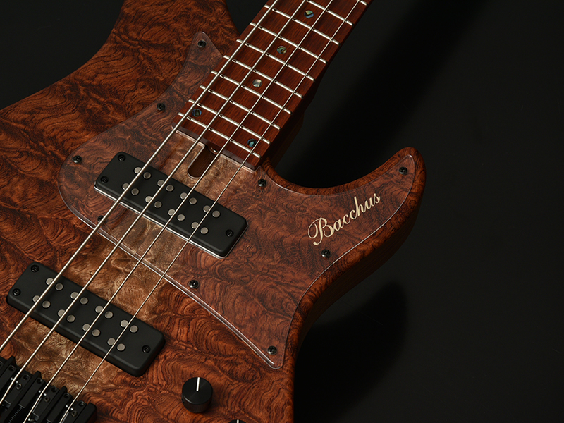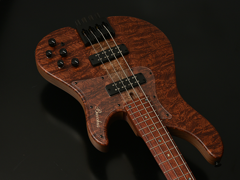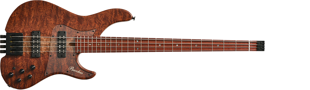 Bacchusのベストセラーエレキベース「WOODLINE 417」を基準に、Hipshot Headless Bass System Bを搭載したヘッドレスベースを製作しました。新たに描き起こしたボディアウトラインは、レギュラーモデルBacchus WOODLINEが持つディンキーシェイプ、シャープなボディエッジの印象を残しながら、ヘッドレスモデル特有の違和感を最小限に抑えるボディサイズ、ボディバランスを実現。24Fまでスムーズに演奏できる深いカッタウェイも自慢です。ヘッドレスベースの新たな指針となるポテンシャルを秘めた、高い完成度の意欲作がついに完成!!うねるような木目が魅力的なキルテッドブビンガをボディトップに。更にネックには硬質なブラッドウッドという木材を使用しています。
