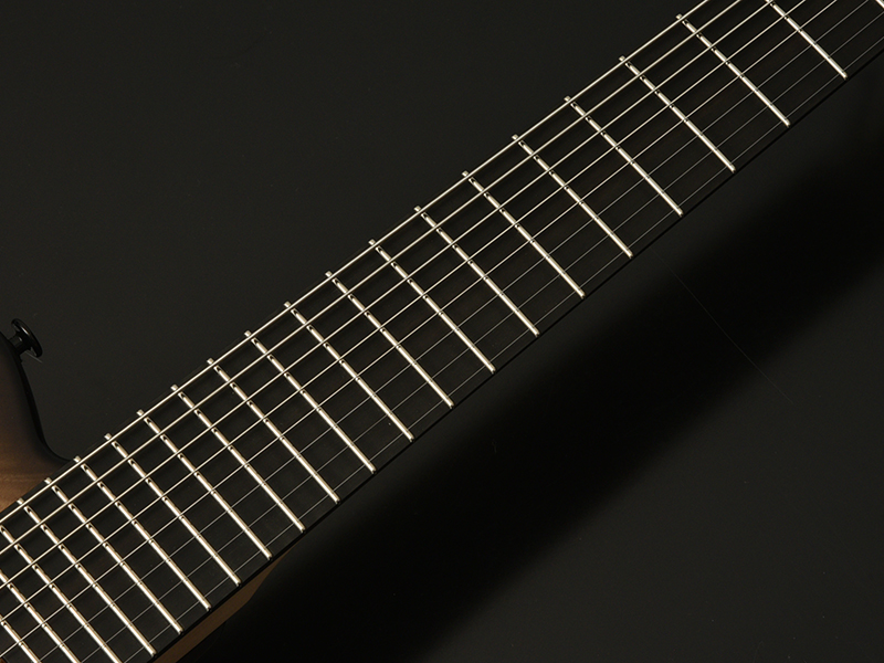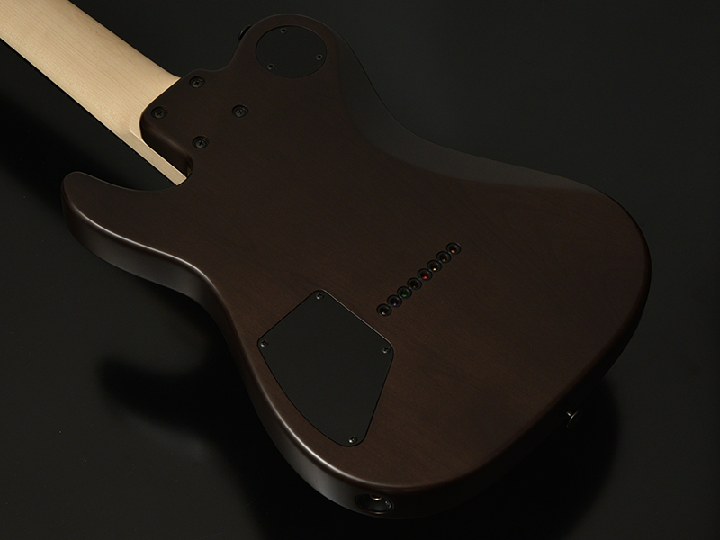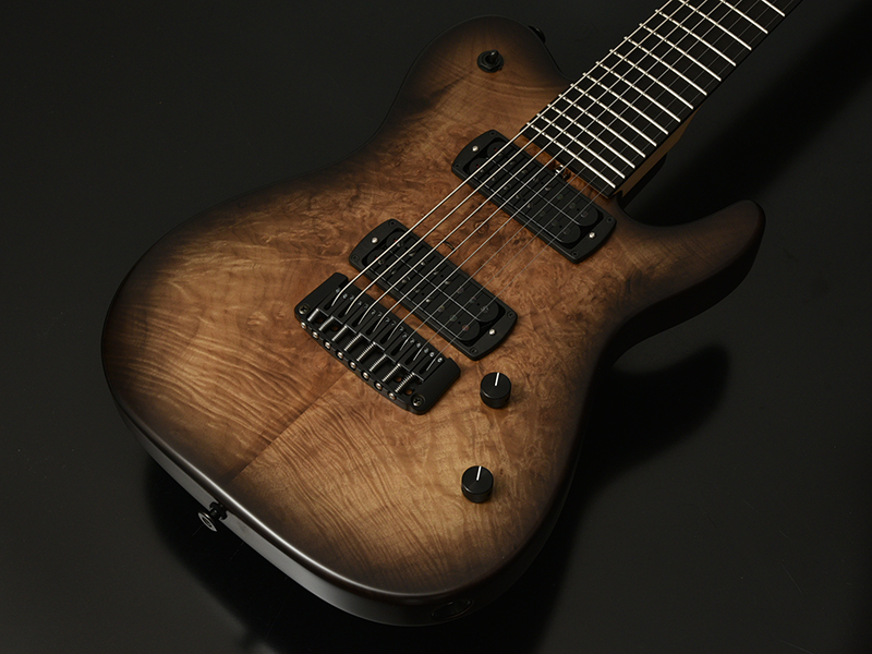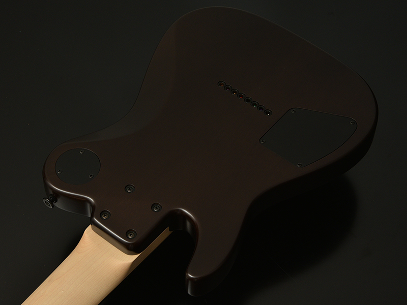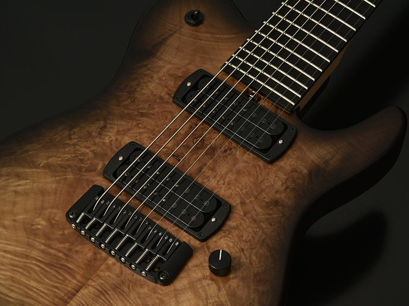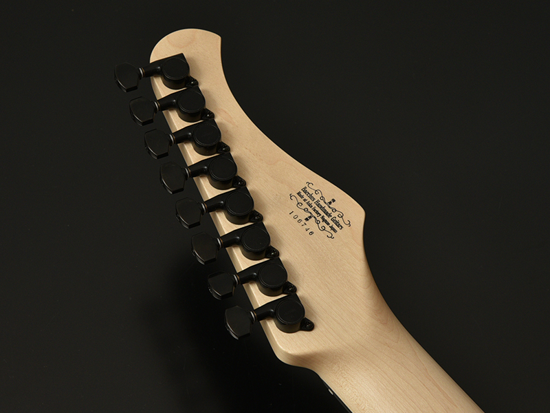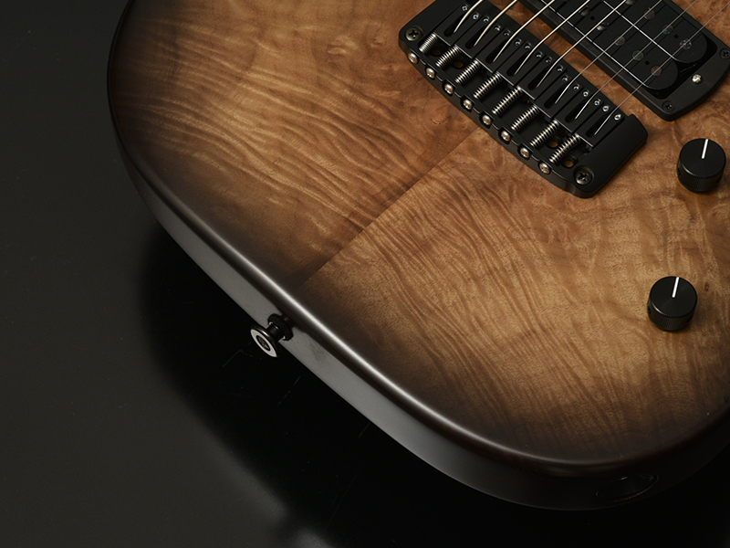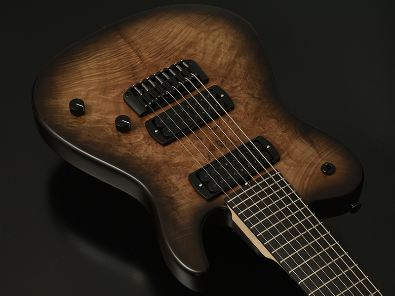 飛鳥ファクトリーのギター作りへの技術力を実感できる、8弦のカスタムモデル。Tシェイプをベースに多弦ギターながら、尖りすぎない絶妙な印象を狙いました。エキゾチックウッドの中でも特に個性的なマートルバールをボディトップに使用しました。ピックアップには、"Mojotone/PW Hornet8"を採用しました。素朴なクリーントーン、ヘビーなリードトーン、厚みのあるコードトーンなど、幅広い音色を生み出しながらも、低音はぼやけることなくタイトであり、高音も耳障りでなく、バランスのとれたピックアップです。高出力ながらも、コイルタップしたときにはピッキングのニュアンスを正確に再現する明瞭なトーンを実現しており、高い汎用性を誇ります。