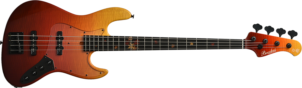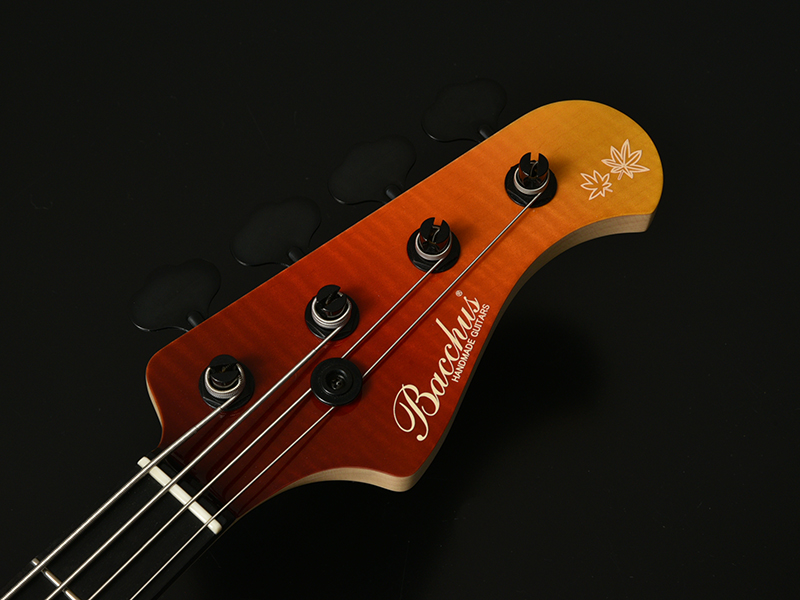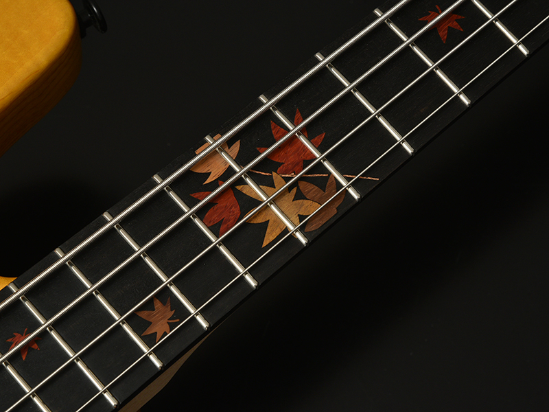 Autumn Leaves:Bacchus初の秋特別モデル「WOODLINE 417AC/AL/E-MF'18」はボディトップ材に「カエデ」を採用しました。秋の紅葉をモチーフとし、指板にはインレイのもみじの葉が揺れ、ボディカラーは鮮やかな紅葉をモチーフとして茶・赤・黄のグラデーションで仕上げました。デザインはもちろんですが、使用している材からも秋を感じることができる1本です。