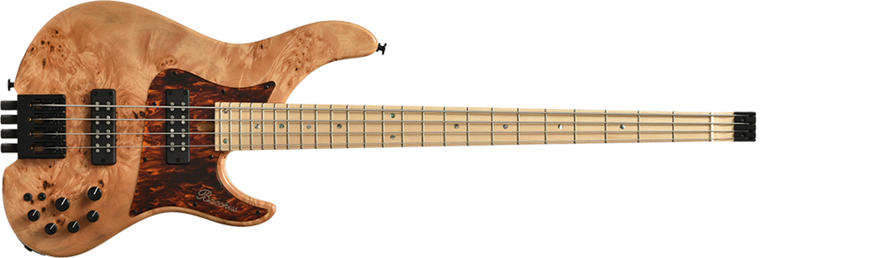 Headless WOODLINE:Bacchus HANDMADE Series"WOODLINE"にヘッドレス仕様が限定で登場。ボディトップにはエキゾチックウッドを採用し、ボディバックはアッシュ材を採用しています。ウッドラインのシャープなボディアウトライン、絶妙なコンターラウンドはそのままに、ヒップショットのヘッドレスベースシステムとアギュラープリアンプを搭載したハイグレードモデルです。