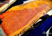 こんにちは。楽器フェア当日まで2週間を切りました。工場では特別モデルが着々と上がりはじめております。加工段階では木材が未だナチュラルな色をしておりましたが、塗装に入るとガラッと印象が変わり鮮やかな印象に。生地着色と相まって杢も美しく特別モデルらしい派手な仕上がりになっています。