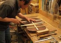 Momose Yasuo gluing bracewoods onto the back board of HD-280 MC2017, the special model for MUSIC CHINA expo held in October.