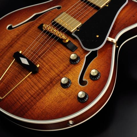 サーモウッドメイプルのネックに、極上の杢が出たハワイアンコアボディ!高級感あるバーストフィニッシュで仕上げました。