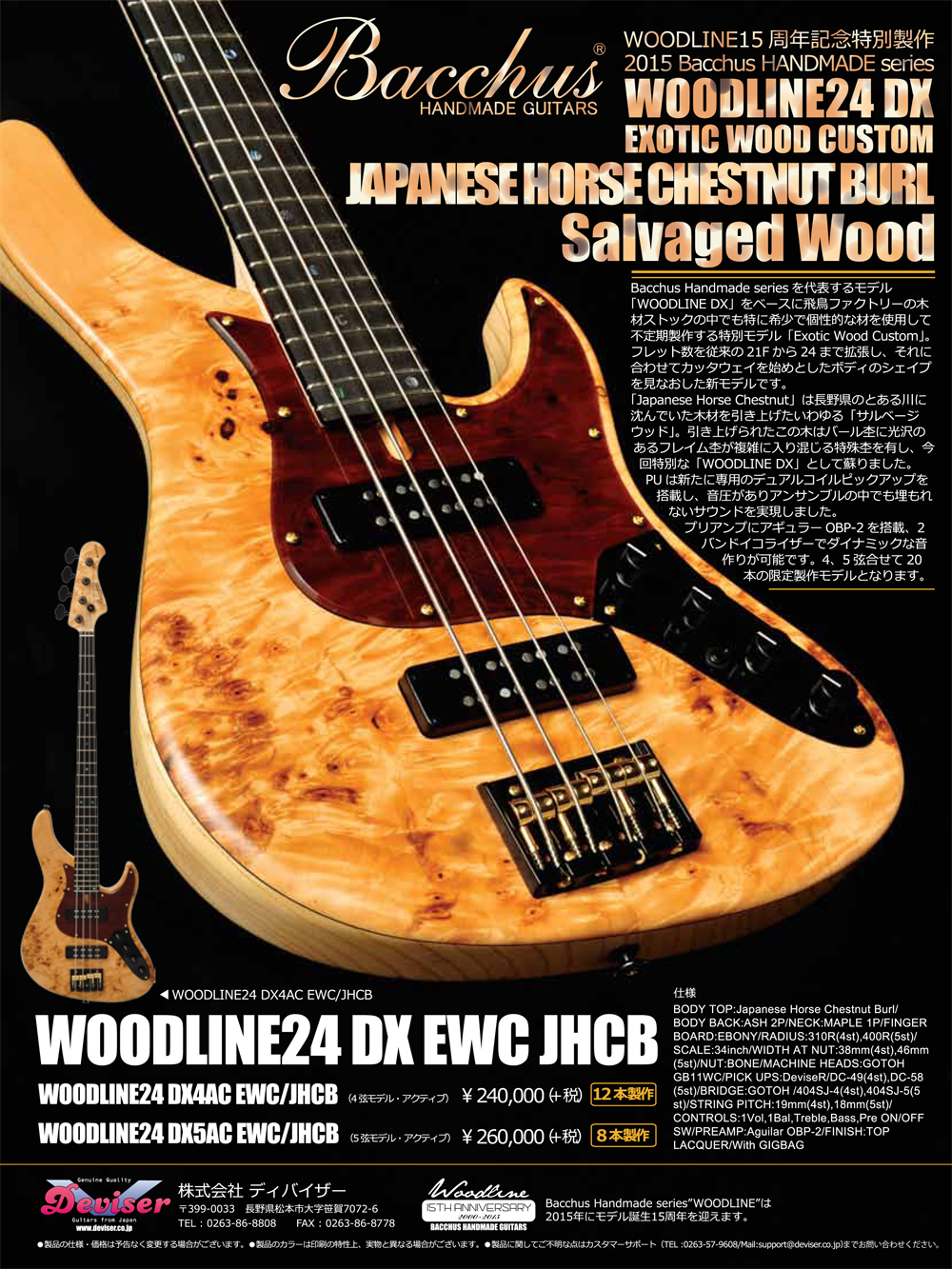 新製品WOODLINE24 DX EWC/JHCBはExotic Wood Customの内の一本。ジャパニーズホースチェスナットバールという木材をボディトップに使用。24F、ハムバッキングPUのニューモデル。