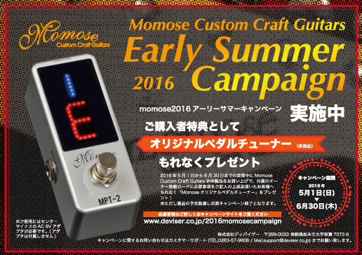 【momoseキャンペーン】2016 Early Summer Campaign 2016年5月1日から6月30日までの期間中にMomose Custom Craft Guitars本体製品をお買い上げのお客様へ、もれなく「Momoseオリジナルペダルチューナー」をプレゼント! 付属のオーナー登録カードに必要事項をご記入の上返送くださいませ!※賞品の予定数達し次第キャンペーン終了となります。 モモセロゴの入ったコンパクトサイズのペダルチューナーです。是非この機会にモモセ製品をお試しください! ■キャンペーン詳細はこちら http://www.deviser.co.jp/2016momosecampaign/ ■モモセホームページ http://www.deviser-momose.com/ 作成者:dev-web3 作成日:2016/4/30(土) 15:30