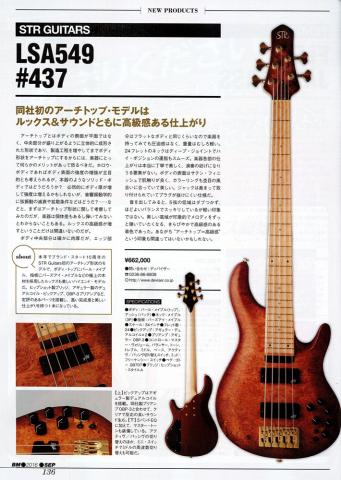 2016年8月19日発売の「ベースマガジン9月号」に、新製品紹介としてSTR GUITARS"LSA549 #437"が掲載されています。STR Guitars初のアーチトップ・モデルであり、ボディトップのバール・メイプル、指板のバーズアイ・メイプルなど随所に極上の木材を採用いたしました。