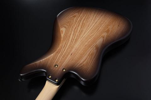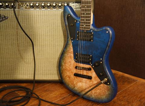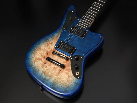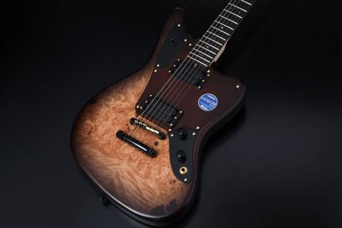 バールメイプルの杢が際立つようにバーストカラーで仕上げ、ヘッド部分もマッチング仕様でバーストを施し丁寧な仕上がりになっています。ピックガードは各モデルのカラーに合わせた1プライのピックガードを採用しました。