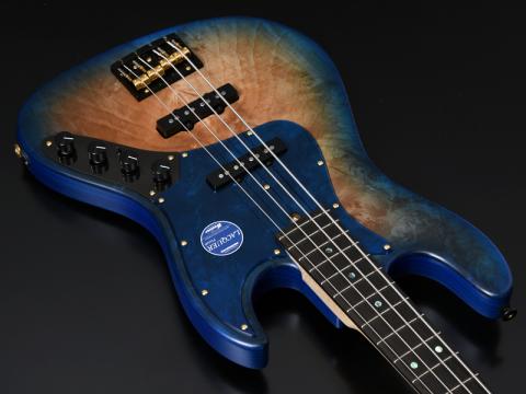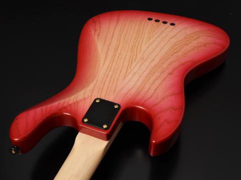 バール杢のインパクトある外観を残すため中央はあえてクリアナチュラルで仕上げています。そしてバール杢を際立たせるよう外周にレッドやブルーのバーストカラーを吹いています!