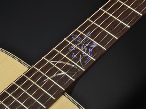 「古材処理ホンジュラスローズウッド」をサイド・バックに使用し、指板には長野県花の「リンドウ」をモチーフとしたインレイが入っています。製品ページでは詳細をご覧いただけます!