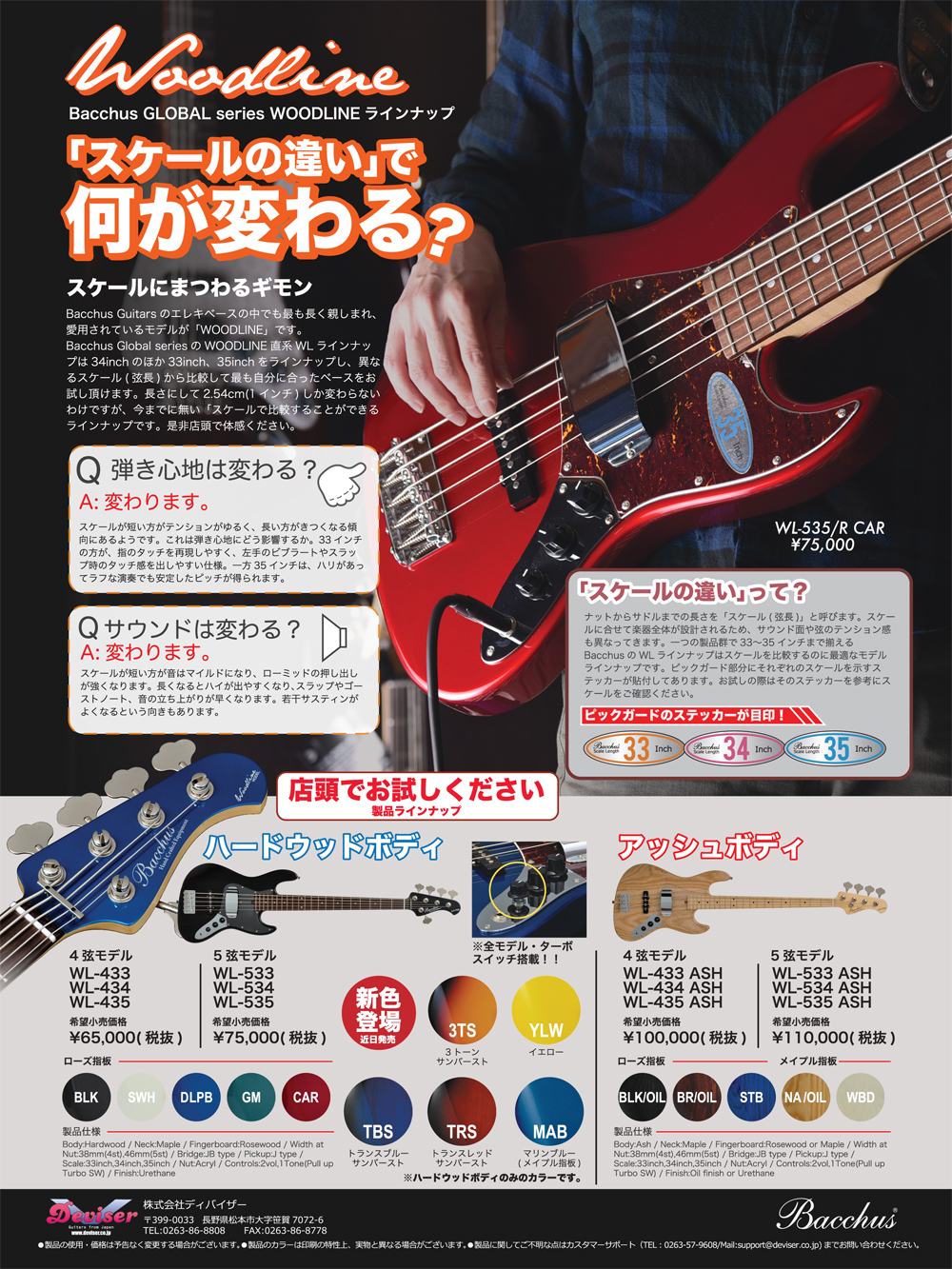 スケールの差によって微妙な違いが生まれる外観や演奏性、サウンドについてQ&A形式で表現。店頭での試奏をお勧めする内容。発売されたWL-434の新色についてもピックアップ。