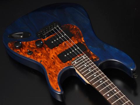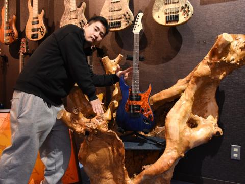 ▲山本様とWorkshopDeviserGuitars制作のINSPIRATION CUSTOM"IMPERIAL-I.C"をトチの木スタンドにのせて。