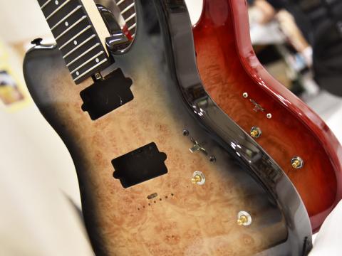 この度完成したモデルは6機種。マホガニーボディモデルと、トップにバールメイプルを貼ったモデルをラインナップしています。