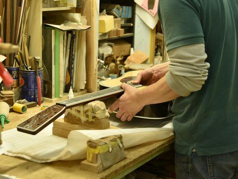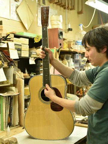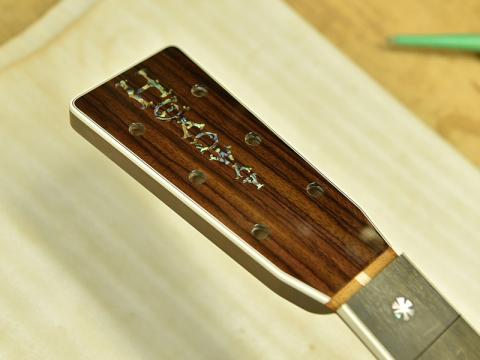 アドバンスドリアシフトはノーマルの位置から若干ブリッジ側に寄せたレイアウト。フォワードシフト、ノーマルの音の傾向を踏まえると、強度が上がり振動しづらくなることで、当初は「硬く扱いづらい音になるのではないか」という見方もありましたが、数本制作する中で得られた結果は音の芯、特に近年のヘッドウェイで少し弱かったプレーン弦(1,2弦)の鳴りに存在感が増した、という予想外の結果でした。1音1音しっかりと鳴り響き、芯のある迫力のサウンドを実現。また、位置をブリッジ側へ寄せることでトップ材に対しての丈夫さも増しています。