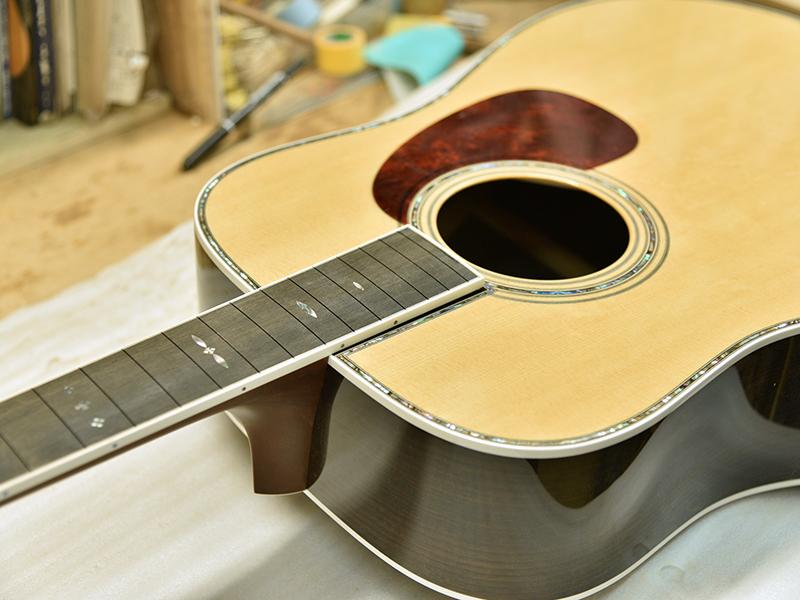 ボディトップには、熊が爪で引っ掻いた跡の様に見えるところからその名がついたベアクロー・シトカスプルースを使用。個性的な外観が印象的な1本に仕上がります。通常の均整のとれた木目のシトカスプルースに比べ木質が複雑になることから、音質面でも深みが増すと見る向きもあります。