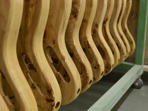 カラーは3色ラインナップしており、バールポプラの杢目を活かすようバーストカラーで仕上げています。ヘッドにもバールポプラをラミネートし、マッチングカラーで仕上げています。