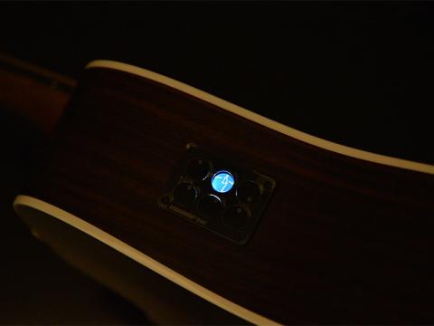 様々な演奏シーンを想定してFishman Inkを搭載しました。アウトプットジャック横にバッテリーボックスを備え、9V電池で駆動します。ボディサイドにコントロールパネルがあり、Treble,Middle,Bass,Brillianceという4つのイコライザーセクション+ボリュームコントロール、チューナーまで、多くの機能をコンパクトな筐体に収めています。