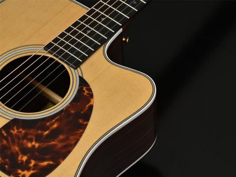 しかしカッタウェイのアコギというと文字通りハイフレ付近のボディをカットしてしまう点に加え、抱えやすさなどを考慮してボディ全体のアウトラインも小さ目のシェイプになってしまうことから、ギター全体の鳴り方もコンパクトになりがちです。