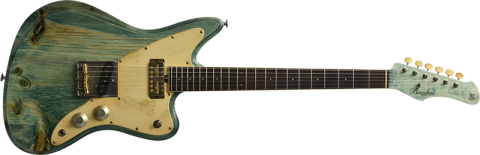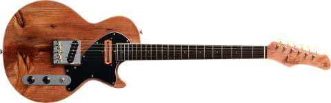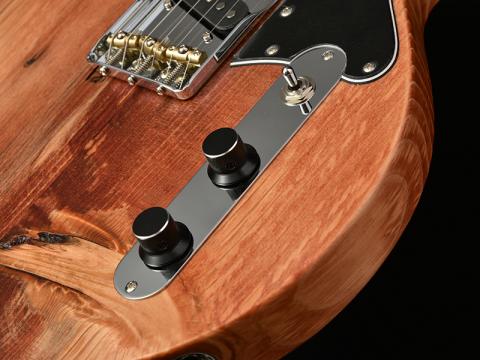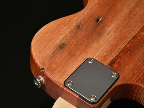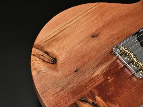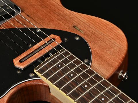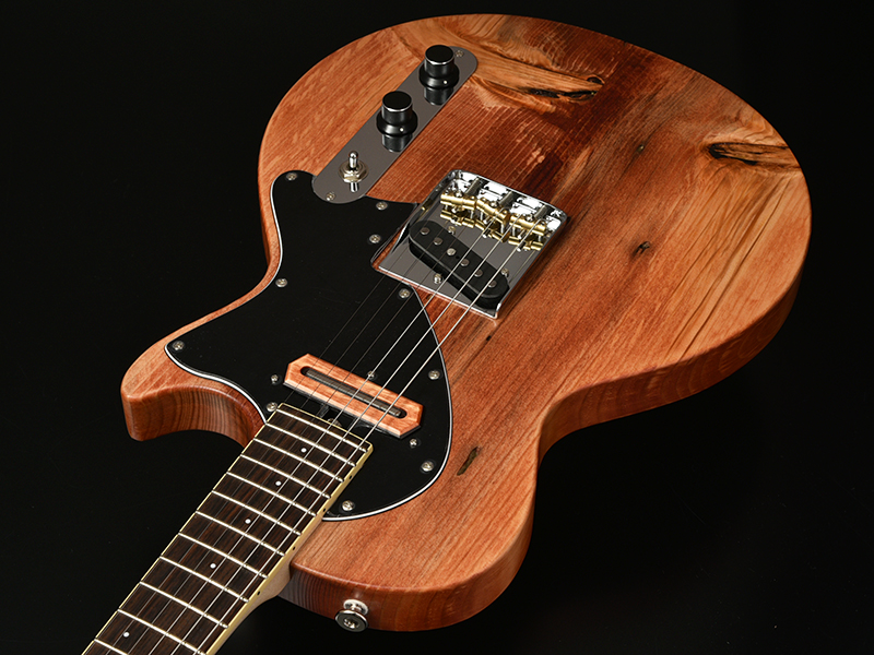 LPタイプの流れを汲むボディシェイプではありますが、リアピックアップからブリッジユニットにかけてはTLらしさもあり、フロントピックアップはジャズギターの開祖チャーリークリスチャンをモチーフとするシングルピックアップ。しかもこのピックアップカバーにもアカマツを使用し、外観上のアクセントになっています。