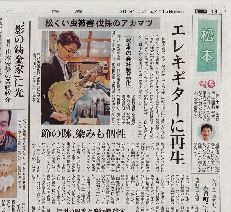 公開時期 2018/4/13 Introduction 2018年4月13日付中日新聞・長野版18面に赤松ギターについて取り上げて頂きました。 ■中日新聞WEBサイト http://www.chunichi.co.jp/article/nagano/ Brand Bacchus 作成者:dev-web6 作成日:2018/4/13(金) 11:13