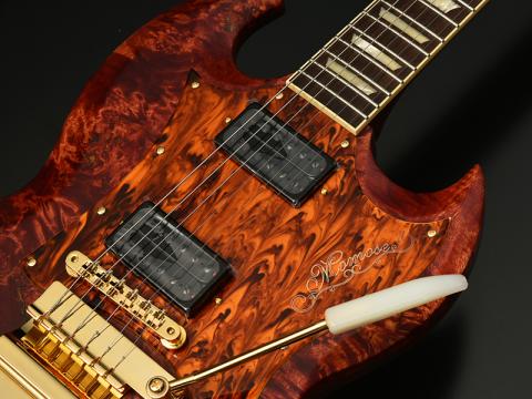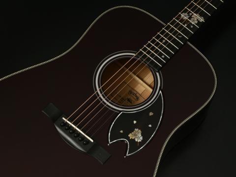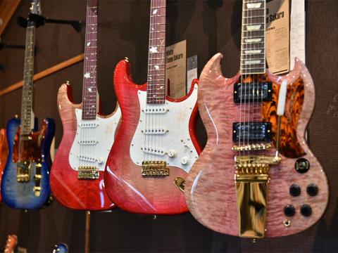 桜を使用したエレキギターでは、鮮やかな赤を基調として、バーストフィニッシュとグラデーションフィニッシュの2パターンを展開。どちらのモデルにも桜の花びらのモチーフが入れられています。