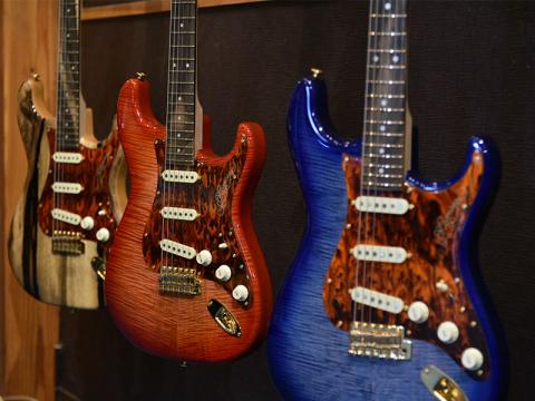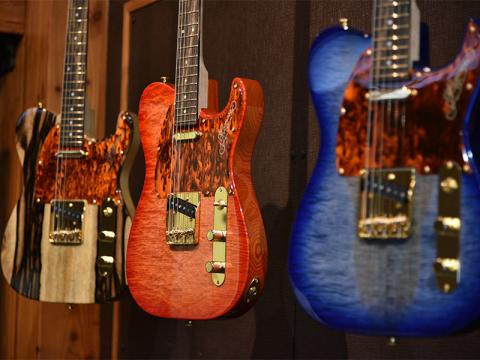展示エリアでも特にまとまって目立っていたのがMSGモデル。バールポプラをシースルーのブルーで仕上げたモデル、キルテッドメイプルをレッドカラーで仕上げたモデル、カンファーやキルトマホなどなどオンパレードです。しかもどのモデルもボディトップ材とバック材が1:1の厚みで使用される「ハーフ&ハーフボディ」仕様。豊富な木材ストックだからこそ出来るワンオフモデルです。
