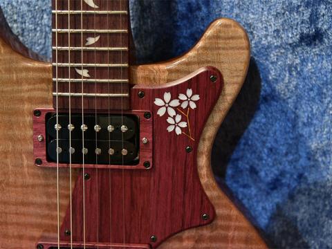エレキギターでも桜モデルは大人気。今回T-Masterをベースにシンライン構造の桜ボディモデルを製作。ピックガードにはパープルハートに桜のインレイを入れ、サウンドホールも桜の花びらをモチーフにしました。