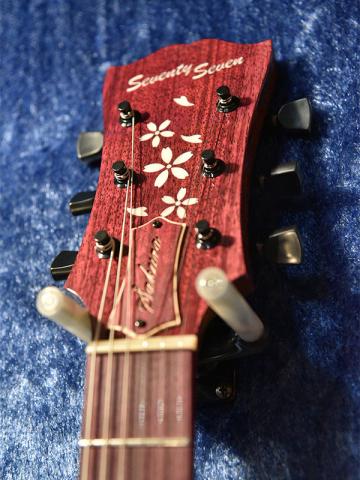 制作本数が少なく希少なモデルとなっているSeventySeven Guitarsの各種モデル。今回の商談会ではALBATROSSをフレイム杢の出た桜材で製作しました。