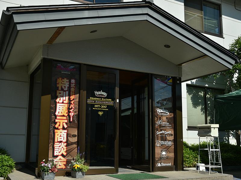 別棟からディバイザー本社までは徒歩5分くらい。本社2Fショールームではエレキギター、エレキベースの展示が行われています。