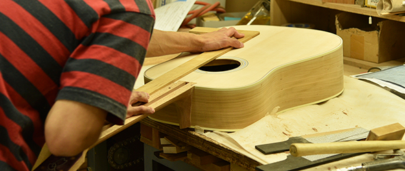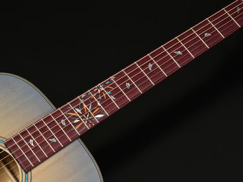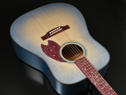 ボディサイド・バックに使用されたのは長野県松本市内でとれた桜材。適度に優しいニュアンスを持つ桜ギターのサウンドですが、ARS(アドバンスドリアシフト)Xブレイシングの影響からか、立ち上がり良く、音の粒立ちも揃いました。見た目の個性的な印象とはうらはらに、素直なサウンドが特徴です。