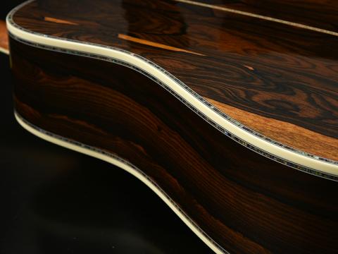 豪華なバインディングが目を惹くJTシリーズの最上位機種です。ボディサイド・バック材に硬質なジリコーテ材を用いることで、木目の美しさだけでなくサウンド面でも重厚な低音域ときらびやかな高音域が得られ、ラインナップの中でも一際豪奢な一本に仕上がっています。