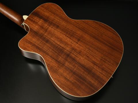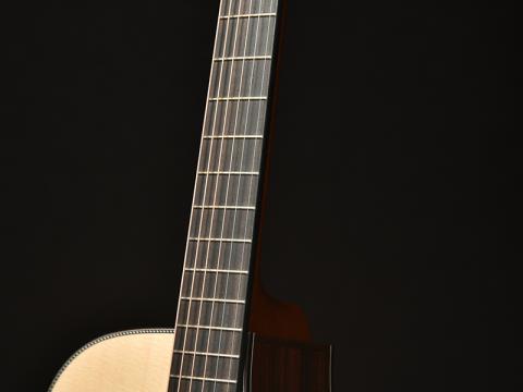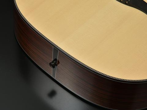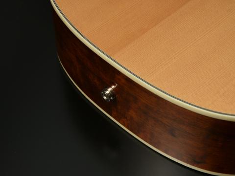 いわゆるモダンなアコースティックギターでは同じくエルボー部分でボディトップ・ボディサイドとは別に木材を切り替え、肘の当たりを楽にするというデザインもありますが、これは加工上の負担が大きく、外観にも大きく影響するため、本モデルではあえて採用しませんでした。演奏性の向上のためのほんの少しの加工です。触って頂ければ十分に効果は実感いただける、弾き手に嬉しい仕上げです。