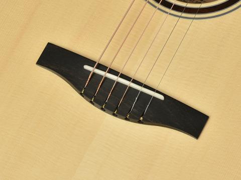 ボディに押し込むブリッジピンを使用しない「ピンレスブリッジ」 仕様。従来のブリッジピンで固定される張り方に比べて、サドルへの弦の角度が浅くなることで弦のテンション感も下がります。