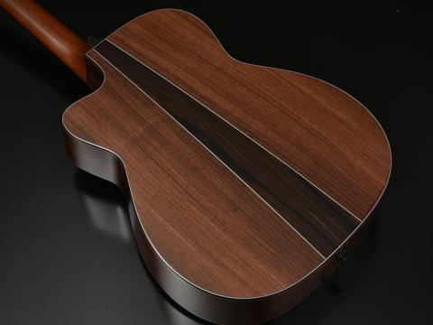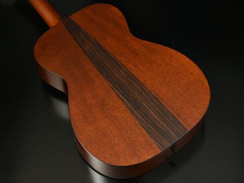 ホンジュラスマホガニーのマイルドな響きは弾き手を魅了するものですが、少しだけ輪郭をはっきりさせるため、3ピースバックの中央にローズウッドをレイアウトしました。狙い通り各音の分離感に一部影響を与えています。