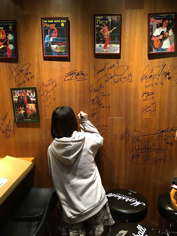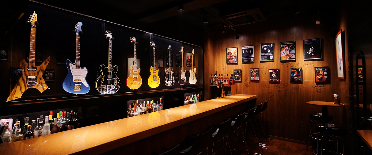 JR秋葉原駅から徒歩2分の立地にあるバー、ライブホール、スタジオを兼ねる会場「イケベック」。バースペースでは名だたるトップ・ミュージシャンたちにサインされたギターがずらりと展示され、ロック好きにはたまらない空間です。