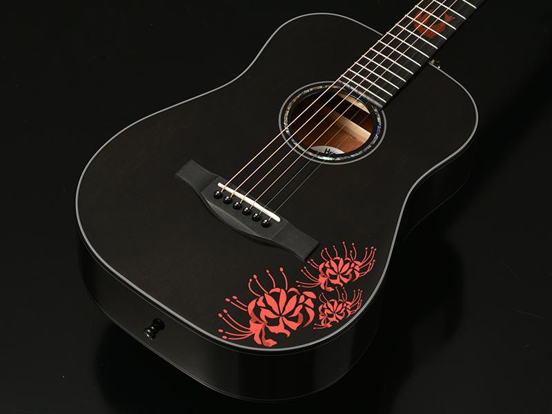 この彼岸花は、おさむらいさんのオリジナル楽曲「相思花」(彼岸花の別名)から着想を得ています。ギターを抱えたときに花が上を向くように、敢えて向きを傾けて配置するという拘りぶりです。