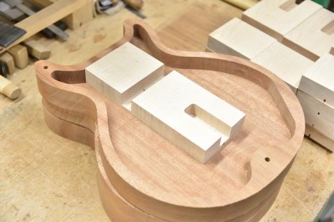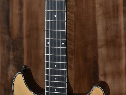 フラットトップのコンパクトなボディサイズながらボディバック材の空洞部分をくり抜くチェンバー構造と異なり、ボディ全体をくり抜いてからセンターブロックを配置するセミアコースティックと同じような手法を取っております。