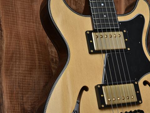 そして、ホロウボディらしいエアー感・生鳴りを出すため程よく体積を削り、ソリッドなレスポンスの良さを残しつつエアー感と両立させております。