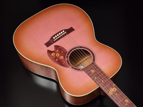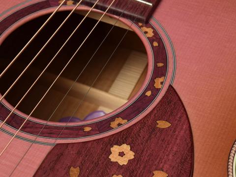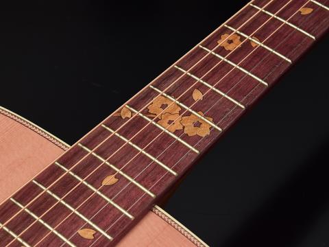 そして、桜ギターモデルでは初の試みである「ロゼッタへのインレイ」を施しています。ヘッドからピックガードまで桜の花びらが舞い散るようなイメージでデザインされています。