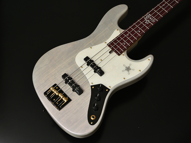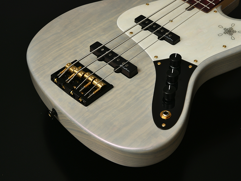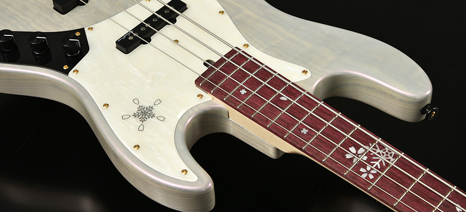 今回のモデルは、ボディトップに「桜材」を採用しました。冬に咲くサクラをモチーフとしたデザインが魅力です。指板にはパープルハート材を採用し、ヘッドからピックガードにかけて、桜の花びらと雪の結晶が彩ります。