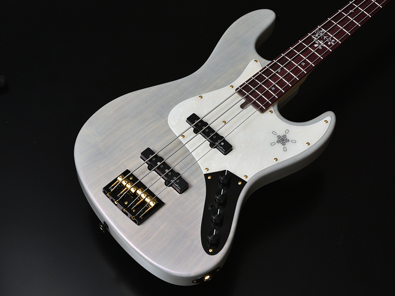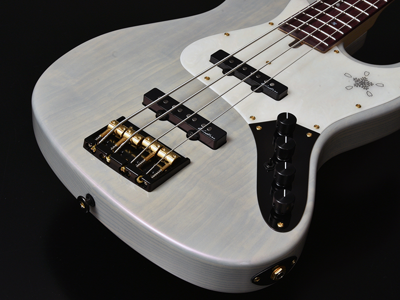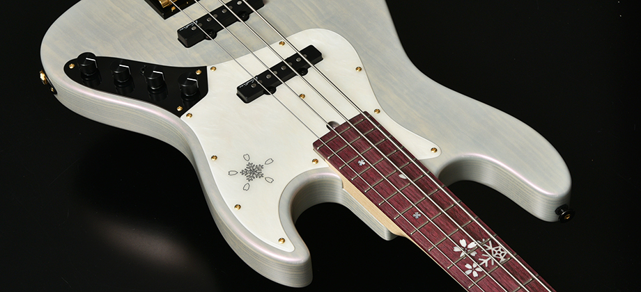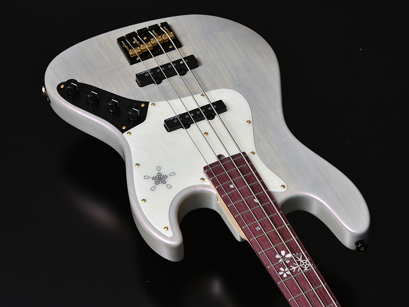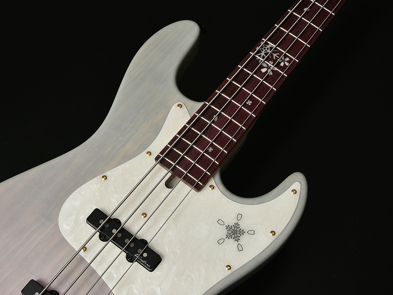今回のモデルは、ボディトップに「桜材」を採用しました。冬に咲くサクラをモチーフとしたデザインが魅力です。指板にはパープルハート材を採用し、ヘッドからピックガードにかけて、桜の花びらと雪の結晶が彩ります。