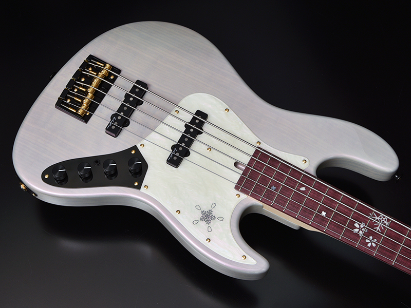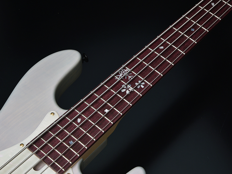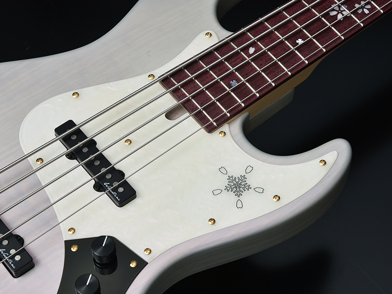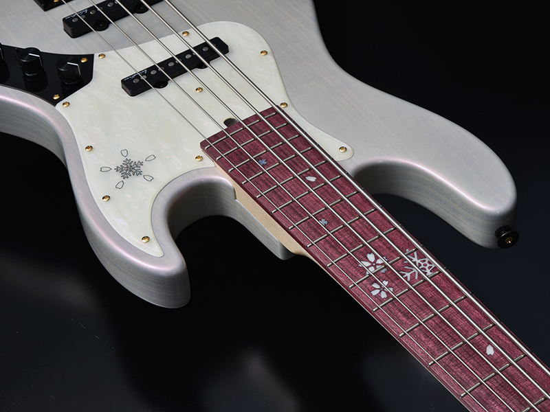 今回のモデルは、ボディトップに「桜材」を採用しました。冬に咲くサクラをモチーフとしたデザインが魅力です。指板にはパープルハート材を採用し、ヘッドからピックガードにかけて、桜の花びらと雪の結晶が彩ります。