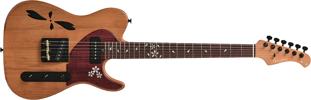 Sakura Hollow Body:飛鳥工場で使用される和材のなかでも特に人気の高い「桜」をボディに採用しました。ボディ低音側を大きくくり抜いたホロウ構造を採用しており、桜の花びらをモチーフとしたホールが印象的なモデルです。ポジションマークなど随所に桜のモチーフを入れ、見た目も華やかな楽器に仕上がりました。桜の季節は短いですが、桜モデルなら年中好きな時に楽しめます。