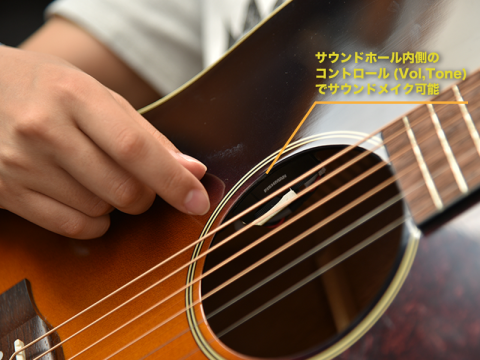 また、「Fishman Sonitone」ピックアップを搭載しており、アンプへの出力も可能です。サウンドホール内のコントロールから手軽にサウンドメイクができます。