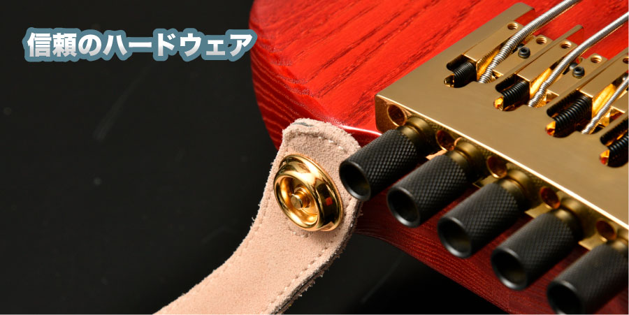 Equipped with a Jim Dunlop flush mount strap lock right out of the box, the strap is sure to hold strong. With a made in America headless system (Bridge & Headset) from Hipshot that is compatible with single ball-end strings. giving the user a wide selection of strings to choose at their own preference.