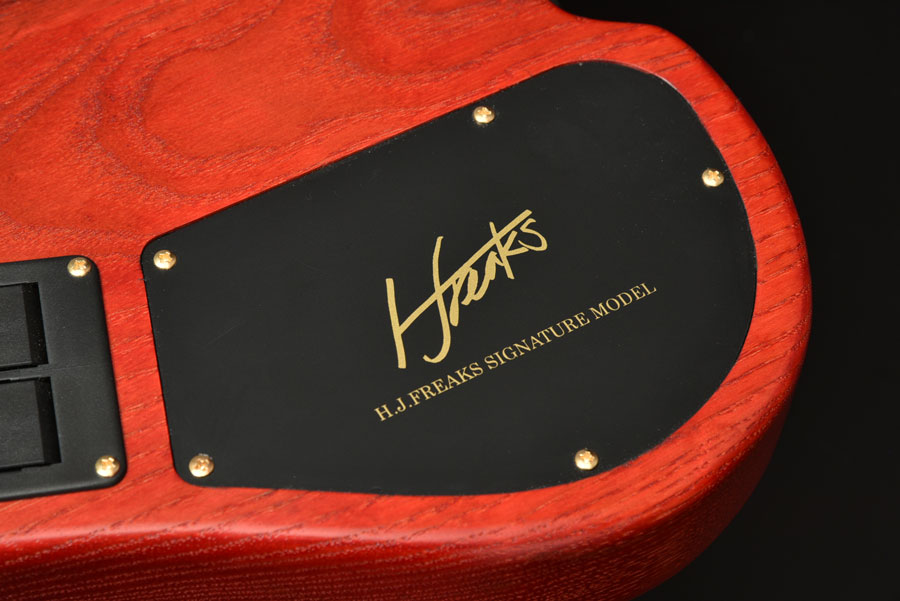 The control layout was designed based on H.J.Freaks’  requests, having, as a result, a special layout that is equipped with a 3 band equalizer and passive tone that allow for a great variety of sounds. Both active and passive tones provide you with a wide range of useful sounds to work with. The kill switch and passive/active switch are both located near the bridge for quick and easy access. The output jack is not located on the bottom, but rather on the top in order for the shielding to not interfere when placing the instrument on its stand or the floor, and also facilitating the handing of the bass, overall creating a more convenient user experience.