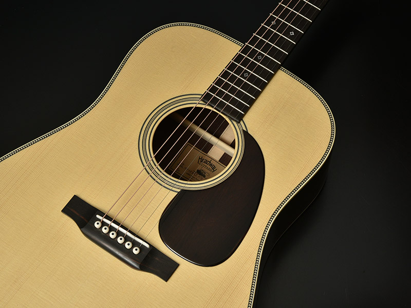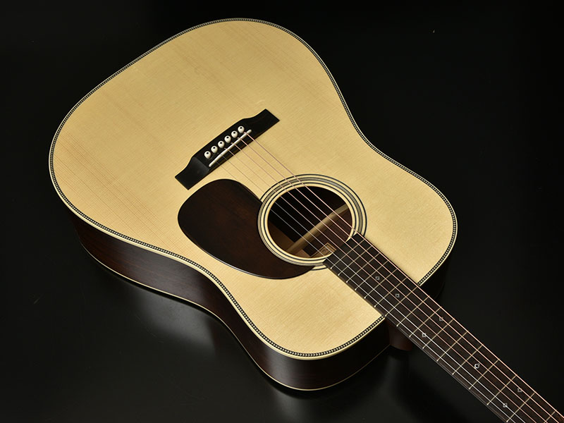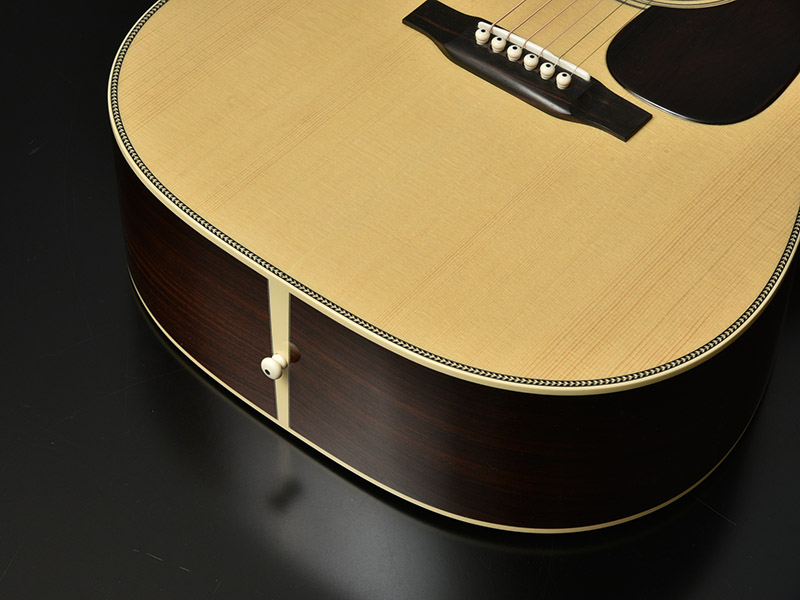 ボディトップにはホワイトスプルースを使用しました。このホワイトスプルースはヨーロピアンスプルースにも似た性質を持ち、シトカ・スプルースなど他のものに比べて柔らかめな質感を持ちます。サウンド面でもこれが影響し、インディアンローズウッドとの相性も非常に良く、 幅があり空間に広がるような音色を得られます。
